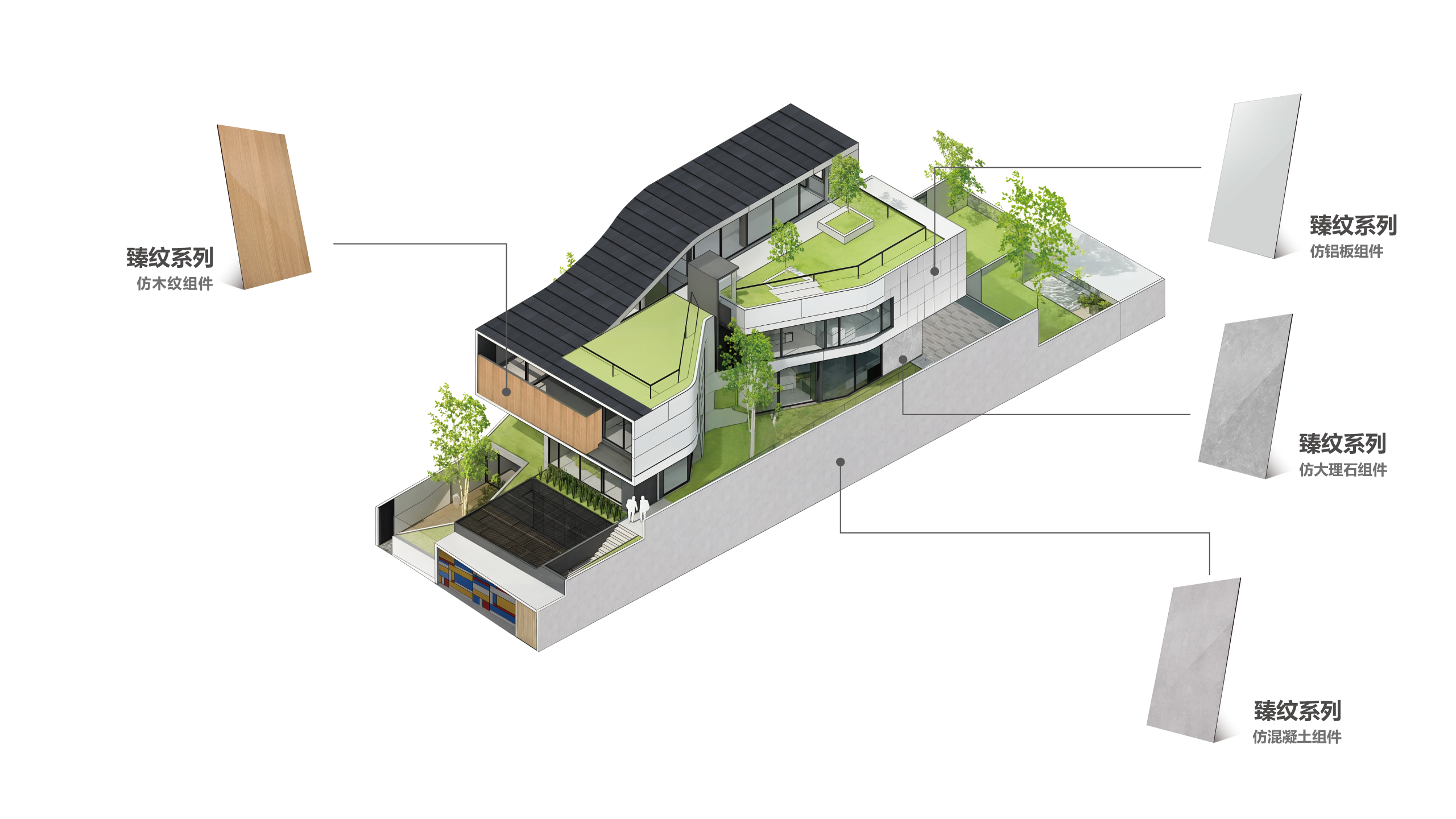 臻纹系列采⽤仿真纹理设计,表⾯可呈现⽊纹、⽯纹等⾃然质感,满⾜现代建筑美学需求。防眩⾼透玻璃有效降低反射,保证光照均匀;同时,作为绿⾊建材,具备环保性能,助⼒可持续建筑发展。